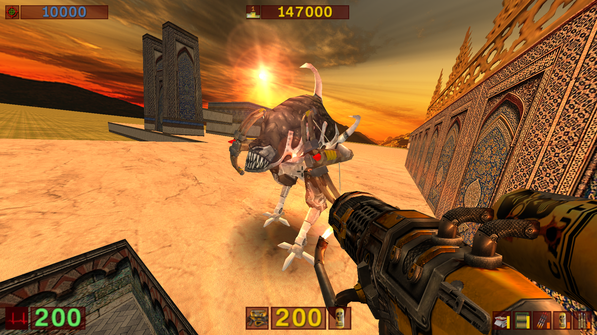 Из-за того что ракетница использует ту же модель снарядов, что и биомеханоид крупный. Биомех решил модернизироваться и теперь у него есть 2 полу вертикальных арбалета. К сожалению есть 1 недостаток, который я не в силах исправить: у модели патронов лежат ненужные аттачменты и чтобы их убрать нужно пересохранить каждый уровень, где находится данный айтем патронов. Ясное дело, что добавлять 2 основные кампании это бред так что чинить это придётся в ручную. Так же надпись при подборе всё ещё остаётся "Ракеты" хотя я прошерстил все текстовые файлики с переводом и изменил в каждом из них "Ракеты" на "Взрывные болты" (не помогло).